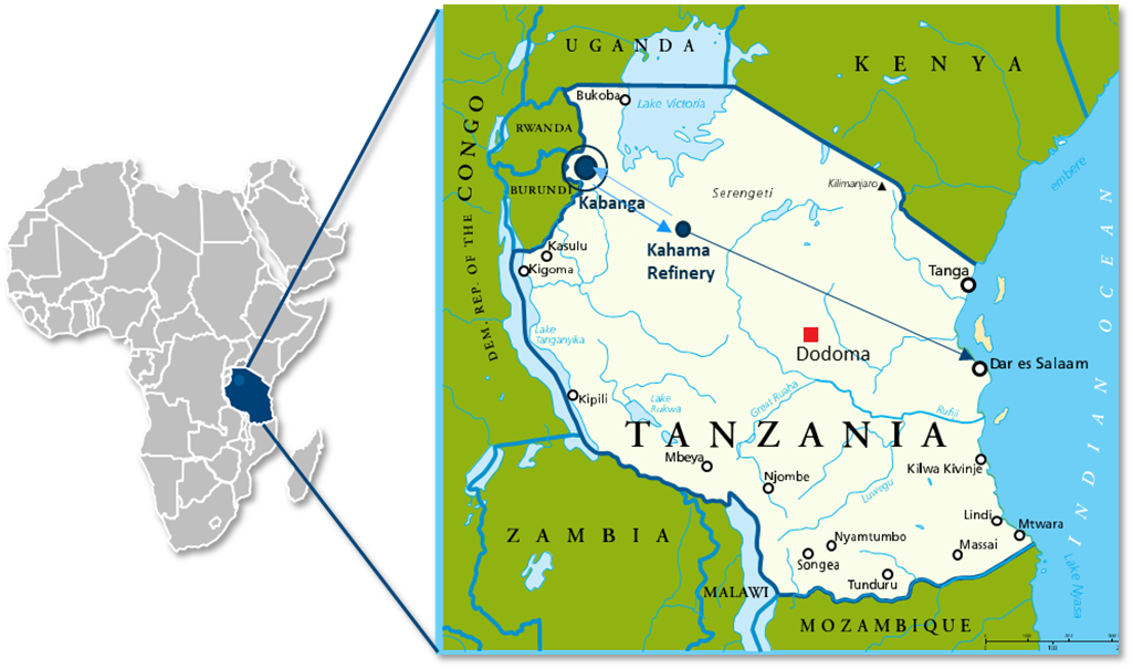 Figure 1: Map showing the location of Kabanga and the Kahama Refinery within Tanzania.