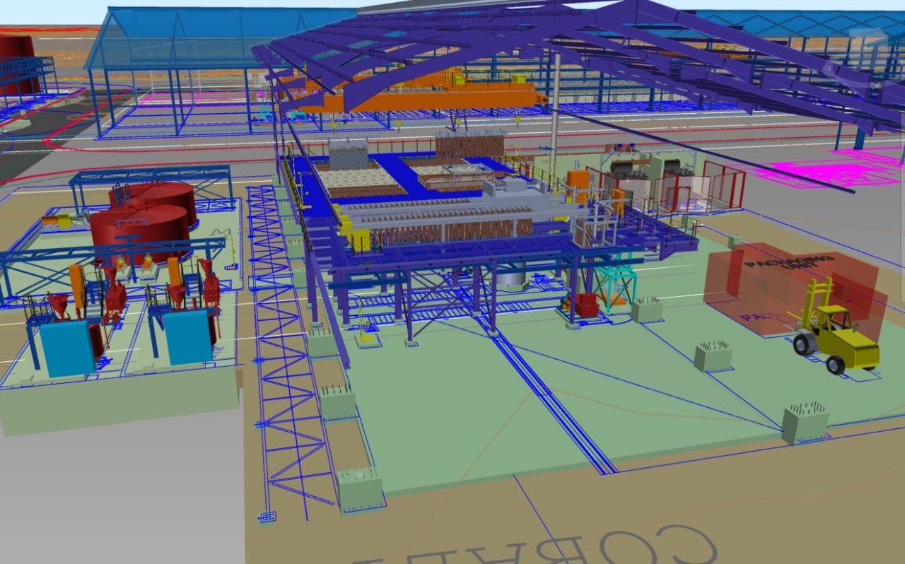 Figure 2: Preliminary three-dimensional design view completed as part of the Kabanga Nickel Project Definitive Feasibility Study showing electrowinning circuits and packaging facilities at the Kahama Hydromet Refinery.