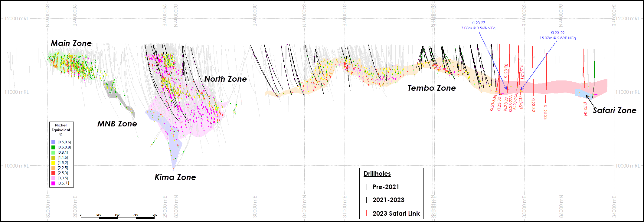 KL23-29: 15.1 meters grading 2.24% nickel, 0.24% copper, and 0.18% cobalt, (2.83% nickel-equivalent) and representing a ~300 meter step out to the north-east of existing Mineral Resources (refer to Lifezone’s January 29, 2024 news release).