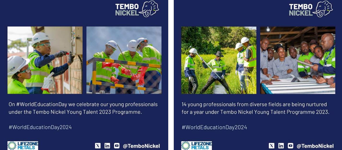 Figure 5: LinkedIn post by Lifezone’s Tanzanian subsidiary, Tembo Nickel Ltd, celebrating World Education Day on January 24, 2024. The goal of the Tembo Nickel Young Talent Program is to empower young professionals with the skills and knowledge needed to thrive in their fields of work.