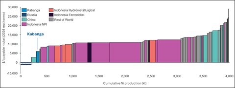 DATA: CRU Nickel Cost Model and CRU Nickel Asset Services. Cost estimates for the Kabanga Project have been provided by Lifezone Metals using CRU price assessments for by-product credits. The chart excludes a small volume of platinum group metals (PGM) miners that produce nickel as a by-product. In USD 2024 real terms.