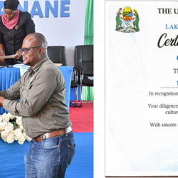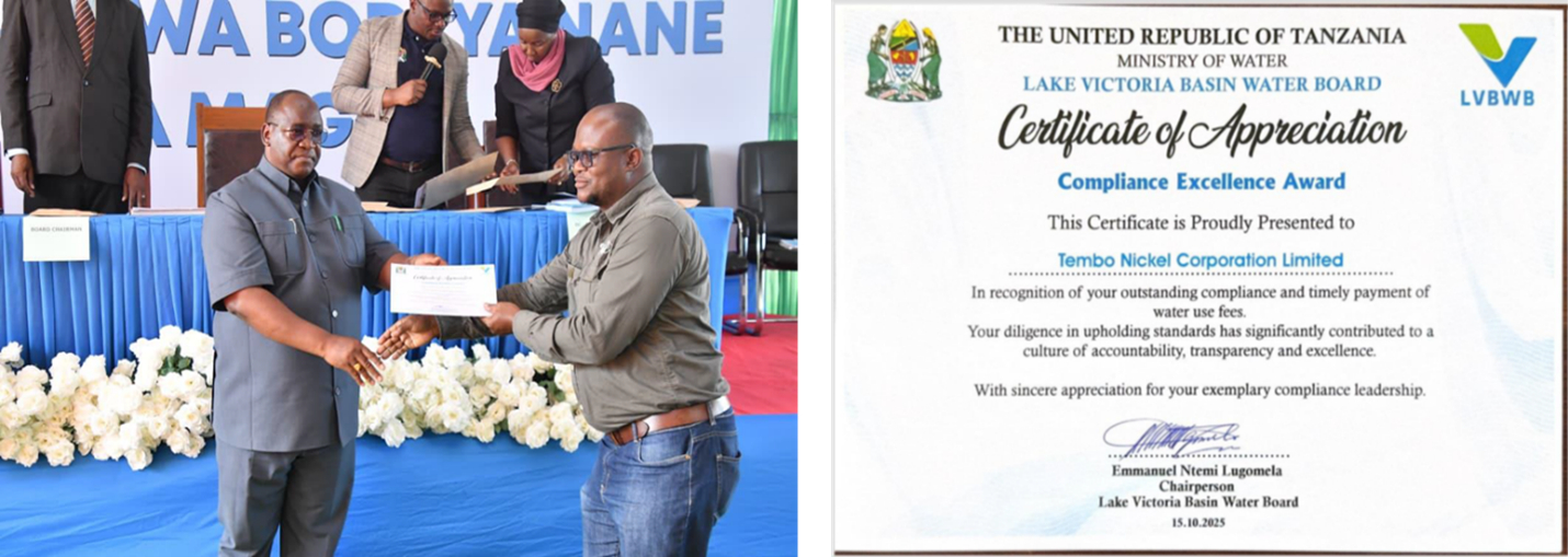 Figure 3: Kabanga General Manager receiving the Compliance Excellence Award from the Mwanza Regional Commissioner on October 15, 2025 (left); certificate of appreciation granted to the project for compliance (right).