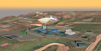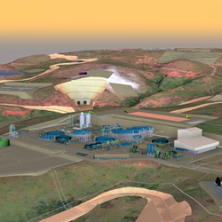 Figure 7: 3D model of the Kabanga site looking east showing the 3.4 Mtpa concentrator and the North Boxcut with the twin declines and associated infrastructure
