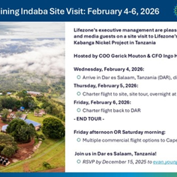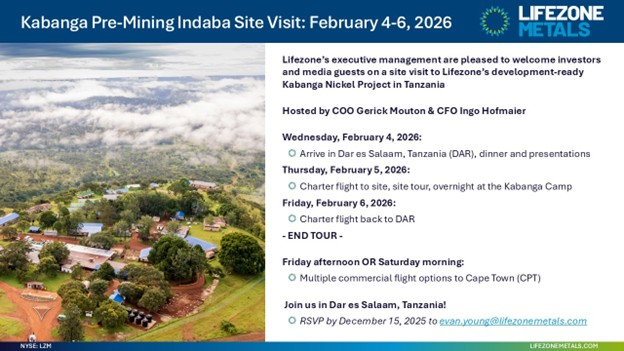 - Lifezone will host several project finance related site visits from mid-January, including a pre-Mining Indaba site visit for shareholders to the Kabanga Nickel Project on February 4-6, 2026, hosted by COO Gerick Mouton and CFO Ingo Hofmaier.